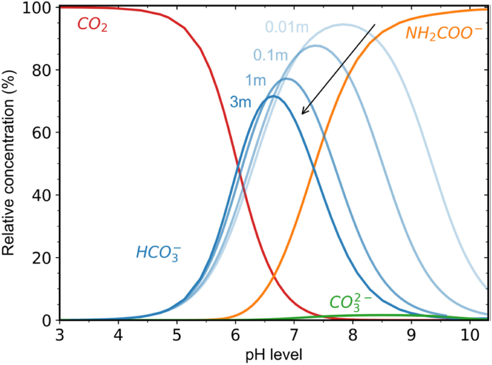 The pH level is the key factor for assessing the dominant carbon form in the ammoniated brine carbonation process. This is important to maximize both the CO2 absorption capacity and the bicarbonate proportion. Fig. 1 illustrates the pH level impact on the relative quantity of bicarbonate ion (