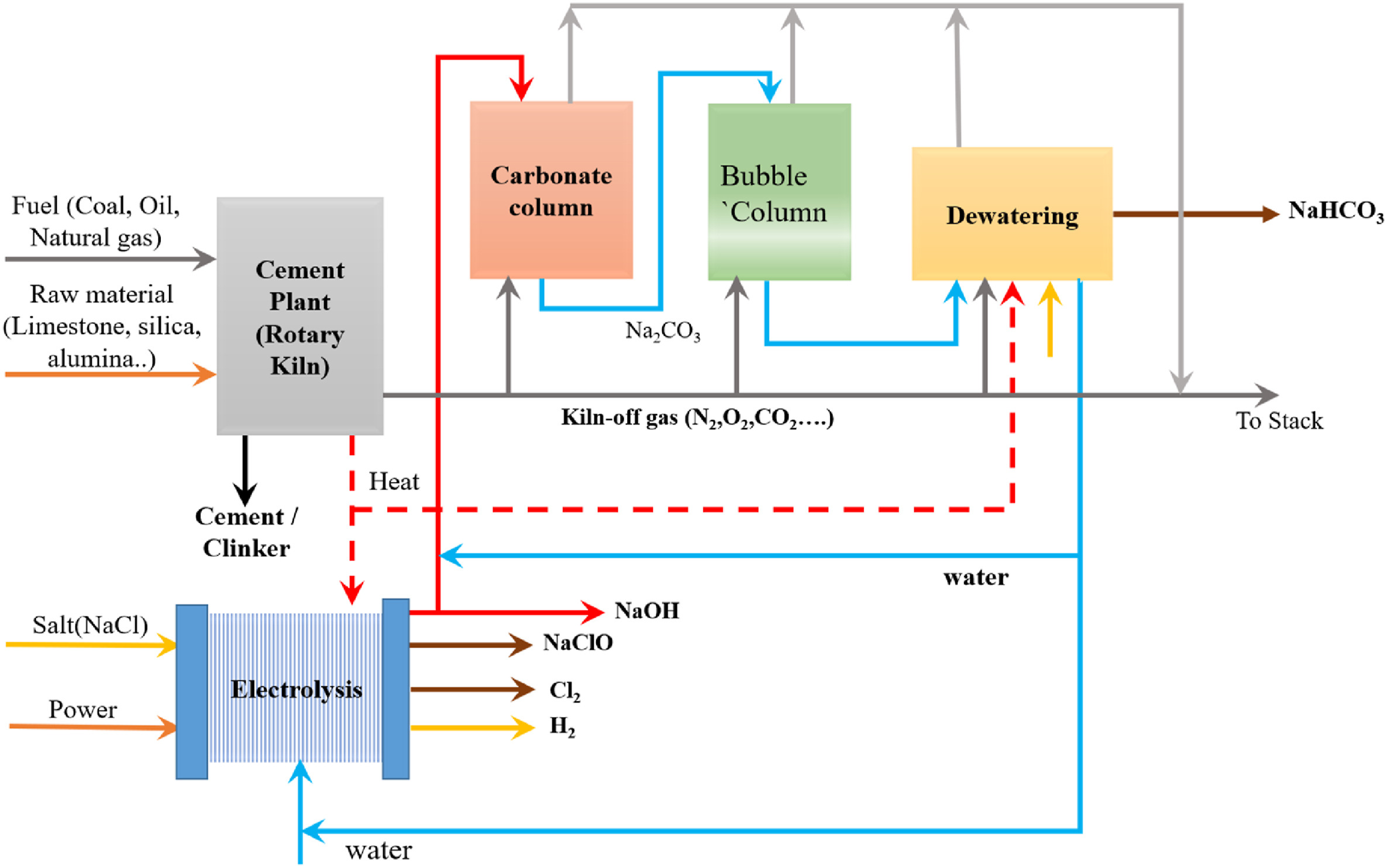 Fig. 5Yoshi et al. [28] compared sodium carbonation routes such as soda ash, Solvay and sodium sulphate carbonation process for the optimization of NaHCO3production through CO2 utilization. They evaluated the process using Aspen plus simulation software and optimization techniques. The result showed that soda ash carbonation emerging as the most favorable option at 35°C, generating a gross profit of US$ 0.23/kg. In another study, Wang et al. [77] conducted a technoeconomic analysis using Aspen Plus to investigate the co-production of high-purity CO2 and NaHCO3 in cement industry using ammonia-sodium sulphate process. The procedure entailed the utilization of methyldiethanolamine (MDEA) for the absorption and desorption of CO2, NH3, and Na2SO4, followed by the carbonization process. Utilizing a saturated Na2SO4 solution boosted the absorption of CO2, resulting in an increased CO2 usage rate when the Na2SO4concentration was raised. The maximum yield of NaHCO3 was achieved at a crystallizer temperature of 35.5°C, whereas the yield decreased as the crystallizer temperature increased. When the pressure for crystallization was raised from 1.0 bar to 2.55 bar, the flow rate of NaHCO3 exhibited a slow increase from 5.60 kmol/h to 5.63 kmol/h in response to the higher reaction pressure. Hence, the influence of crystallizing pressure on the reaction was negligible. In addition, the author ascertained that the economic evaluation of the undertaking yielded a net return of 13.51% after 6.48 years, providing a means to mitigate CO2 emissions while also yielding economic advantages.