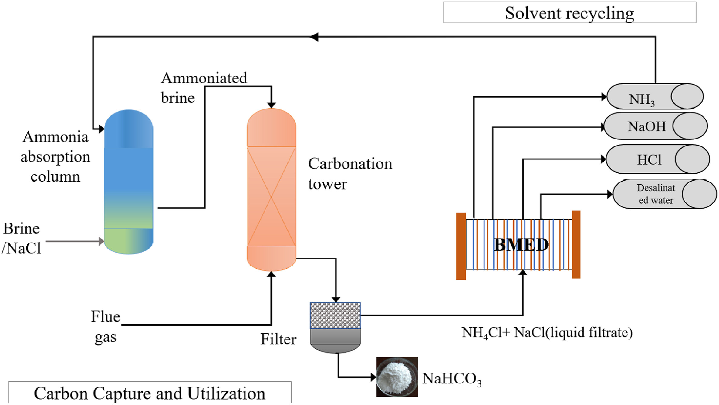 Ammonia is identified as the most suitable and cost-effective absorbent for sodium bicarbonate precipitation in brine solutions. However, limitations such as secondary waste generation and ammonia escape have hindered its widespread use in CCU applications. The integration of Solvay process for production of industrial-grade NaHCO3 with the CO2 utilization process, combined with NH3regeneration through a bipolar membrane electrolysis system, could have the potential to overcome the limitations of traditional carbon utilization methods, such as low efficiency and high costs. Future studies should focus on assessing the techno-economic feasibility of this integrated approach.
