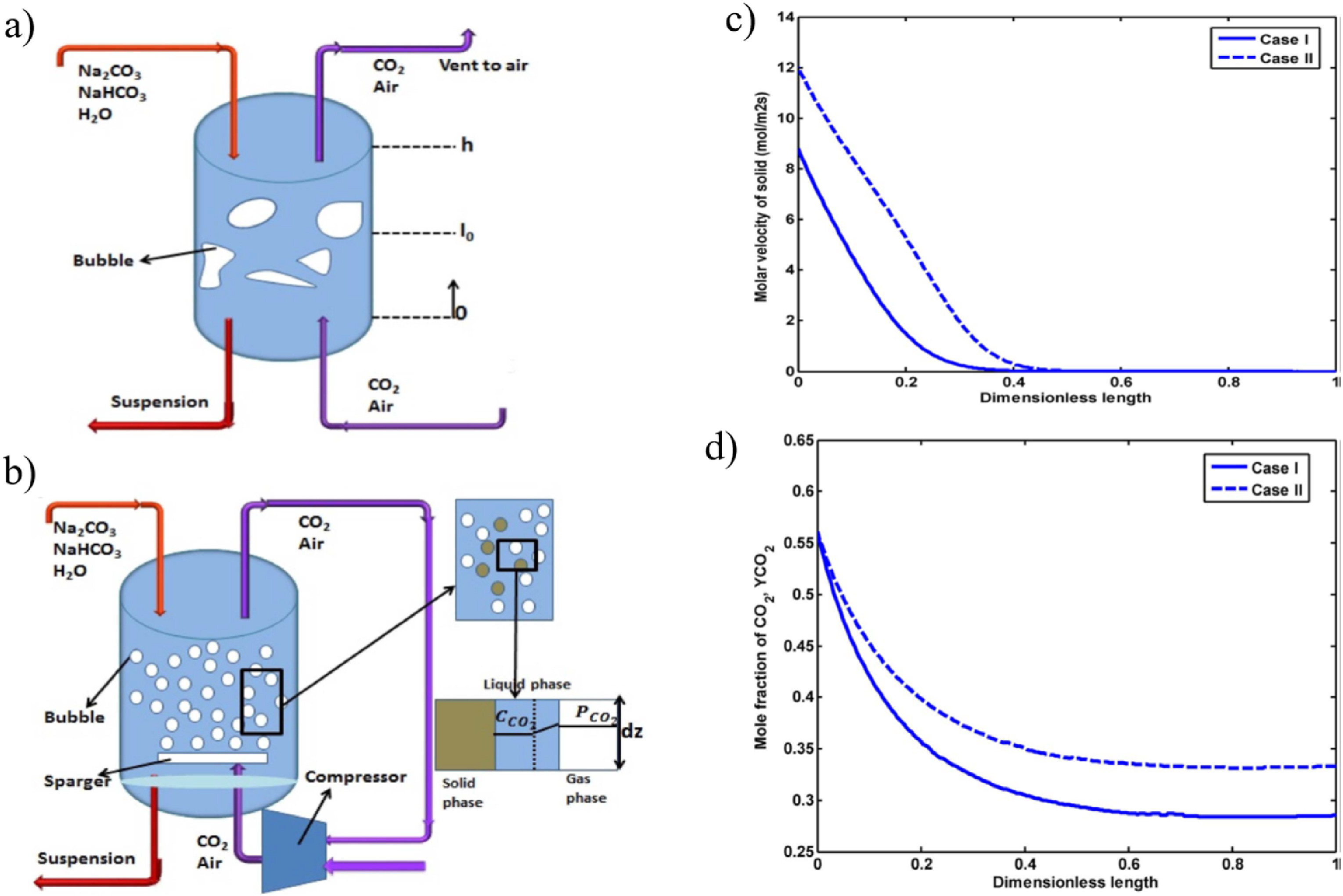 It is generally accepted that the development of precise, comprehensive, and robust plant design modelling is necessary to analyze different operational parameters in a manner that does not put the actual system plant at risk, saving a lot of time and cost. The preferred model should be rigorous and capable of handling all parts of the process while also being simple enough to be readily applied [152]. Maharloo et al. [55] proposed a new configuration of an industrial bubble column for producing high-purity sodium bicarbonate crystals. They developed a computational model involving three-phase mass balance equations to investigate and compare with a conventional bubble column reactor. The configurations of the bubble columns are shown in Fig. 5 (a)(b). The model incorporates the use of the Gauss-Newton method in MATLAB programming based on the backward finite difference method and Danckwerts theory to predict CO2 diffusion and absorption. As shown in Fig. 5 (c), the application of the new reactor configuration improves solid production significantly, leading to a 50% increase in which the model is in good agreement with industrial data, with annual production capacities of 20000 and 30041 ton/year for conventional (case I) and new configuration bubble column (case II), respectively. Moreover, plant data analysis and modeling results reveal that by recycling CO2 in the new configuration, 314 mol/m−2 s−1 CO2 is saved in each loop. the CO2 mole fraction in the gas phase thought the column in new configuration is more than that of conventional process (see Fig. 5 (d)).