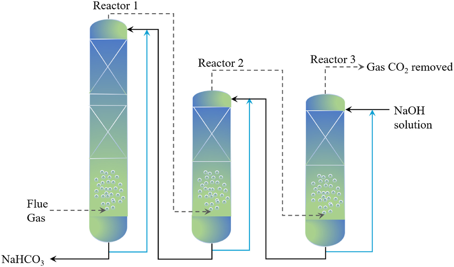 According to different studies, bi-carbonation occurs at a smaller rate compared to carbonation during production of NaHCO3[117]. To solve this, Shim et al. [18]developed distinctive continuous reactor design, as shown in Fig. 6, of an integrated a bubble column connected to structured packing bed reactor. The researchers investigated the effectiveness of CO2 capture at room temperature reacted with NaOH solution generated through NaCl electrolysis. A maximum of 95% CO2 capture and 97% NaHCO3 generation were achieved. However, the process has drawbacks due to its high energy expenditure and complex reactor design [35]. Similarly, Lee et al. [117] employed a series connection of two columns to compensate for the comparatively sluggish pace of the bi-carbonation process. After carbonation occurred in the packed column, which is the initial reactor, bi-carbonation took place in the bubble column. However, the kinetics study which greatly contributes to increasing and boosting the reaction rate, has not been well examined. This can also facilitate the expansion of this method to the industrial scale.