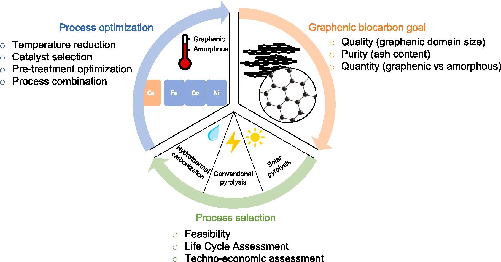 Graphenic phase quality: high quality graphenic domain is met with high treatment temperature no matter the process. High temperatures can be reached more easily with solar pyrolysis that can also be selected because of its low operation time. High quality is also reached using catalytic graphenization. However, the use of metal catalyst and the need of acid washing might lower purity. Using a catalyst naturally volatilizing during pyrolysis is recommended (example of calcium)