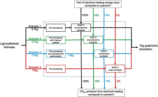 The four phases of a graphenic biocarbon LCA were described in few articles [109], [110], [113], [114]. The scope and goal definition are important to determine the limitations and the focus of the study. In the present review, the goal is to compare different processes leading to the same biocarbon chemistry. Thus, the graphenic biocarbon system boundary is limited to seven main steps: 1) feedstocks collection; 2) its transportation to the conversion plant; 3) a pre-treatment process; 4) a high temperature treatment; 5) transportation of final biocarbon produced; 6) usage and 7) end of life. In this LCA, four scenarios will be reviewed depending on the process and are named S1 (conventional pyrolysis in electric furnace), S2 (addition of catalyst in S1), S3 (hydrothermal carbonization and conventional pyrolysis) and S4 (solar pyrolysis without catalyst). The goal for each scenario is the production of 1 kg of graphenic biocarbon (functional unit). The main estimates for each scenari we proposed are summarized in Fig. 10.