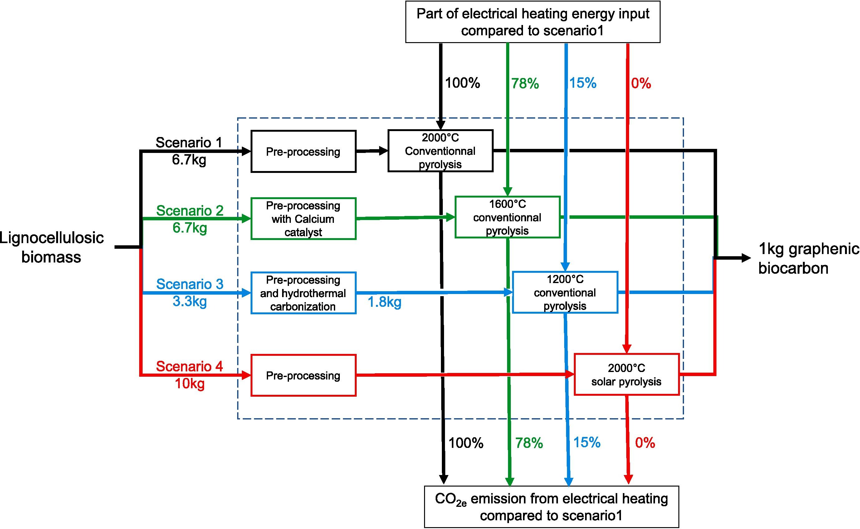 For the fourth scenario, solar energy is selected for high temperature treatment, cutting all the electrical energy inputs in the production step and strongly reducing the impact of electricity usage. In this scenario, the mass loss for fast solar pyrolysis at temperatures over 1200 °C is around 90–92 % [95]. We estimate that 10 kg of initial biomass will be transformed into 1 kg of graphenic solar biocarbon. However, fast pyrolysis favors gas production and thus the emissions from production step are affected. Fig. 10 summarizes our main estimates made for the four scenarios, by focusing on the electrical energy required for the biomass to biocarbon transformation step. It is worth noticing that a certain number of assumptions were made to obtain those estimations.
