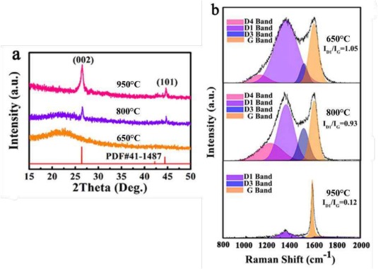 Slow solar pyrolysis on agave bagasse fibers was studied at various temperature and heating rate [91]. By increasing the temperature from 500 °C to 900 °C, the 002 and 100 peaks from X-ray diffractograms became narrower and more defined indicating an evolution to a more crystalline material as seen on Fig. 7. The heating rate was also studied at 500 °C, and the biocarbon was more amorphous at a heating rate of 30 °C/min than 4 °C/min as shown by Raman spectra and X-ray diffractograms. This result emphasizes the importance of heating time in sp3 to sp2 carbon hybridization. Ayala-Cortés et al [91] also highlighted the presence of calcite and calcium oxides which can act as graphenization catalyst [24].