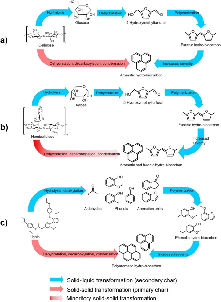 Fig. 6To summarize, cellulose and hemicelluloses hydrolysis produces sugar-like soluble products which form furfurals and aldehydes after dehydration [78]. Furfural forms a furanic hydro-biocarbon through decarboxylation reaction. By increasing severity (temperature, time), furans evolve to aromatic structures and then polyaromatic hydro-biocarbons via a series of reactions including ring-opening, aldol-condensation and Diels-Alder. Hydrolysis of furfural forms phenolic fragments that polymerize with small aldehydes to form phenolic hydro-biocarbon. Lignin, which already contains aromatics groups, is mainly degraded by cleavage of weak C–C bonds (β-O-4 and 5–5 linkage) [52], forming soluble guaiacol and guaiacylglycerol fragments. The first fragment produces phenols while the second generates furans and aldehydes. Although the hydro-biocarbon can exhibit all characteristics, phenols and aldehydes quickly polymerize into phenolic secondary char. Kinetics studies of lignin in sub and supercritical water supported the high reactivity of depolymerization and repolymerization reactions, even at short reaction time [79], [80] In addition, similar functions were obtained in hydro-biocarbons from three types of lignin (dealkaline, alkaline and kraft lignin) [81]. Polyaromatic and phenolic hydro-biocarbons increased the final aromaticity.