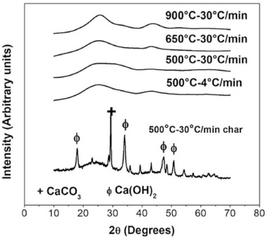 Fig. 7. XRD diffractograms of washed biocarbons produced at different temperatures and heating rates. Calcium carbonate and hydroxide were detected before washing. .