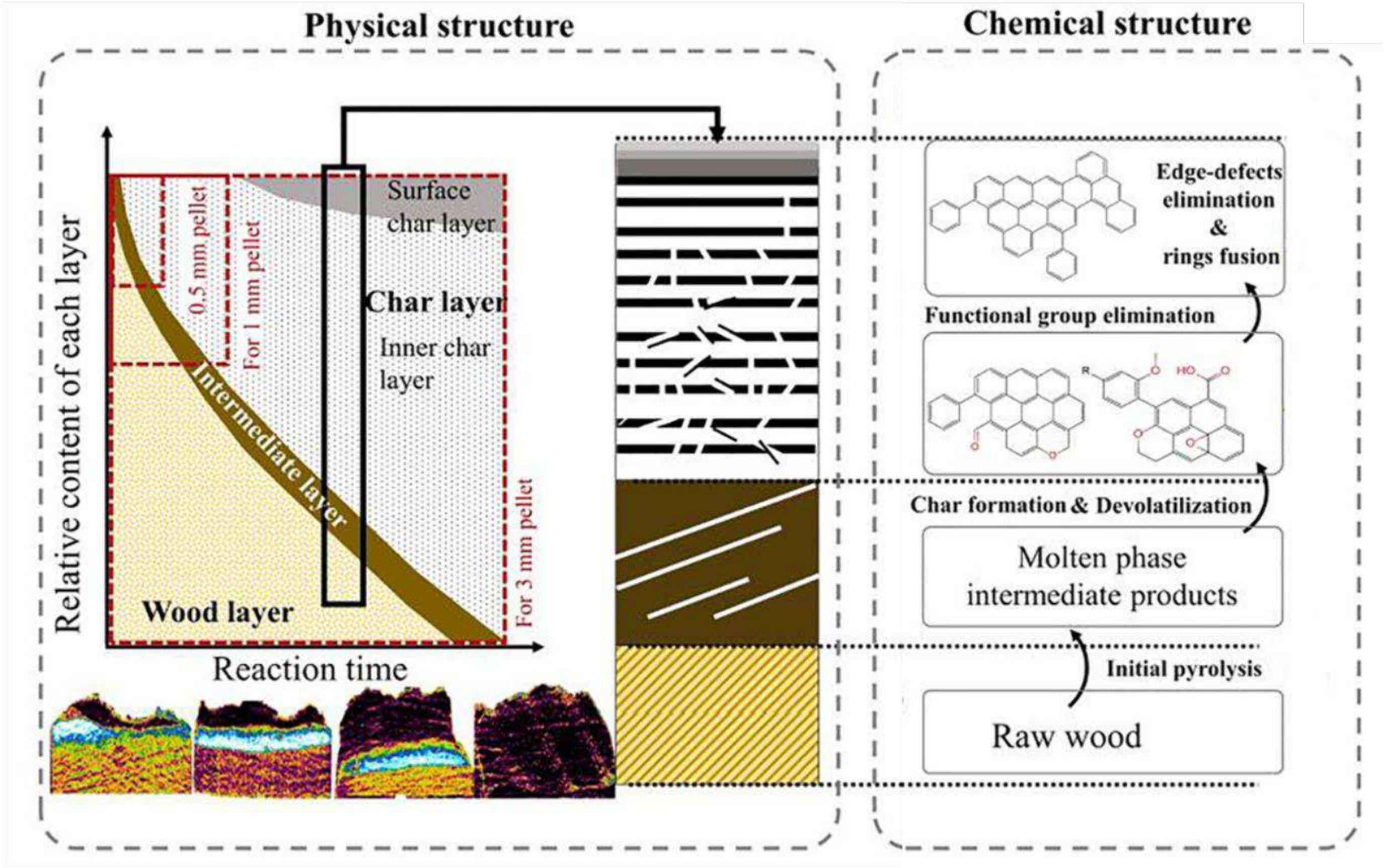 Fig. 9Fig. 8 shows the different stages of the mechanism. The wood was first pyrolyzed and transformed into an intermediate molten phase that continuously produced biocarbon. Condensation of the liquid products improved the number of aromatic rings and oxygen-containing functional groups. By increasing time, aromatic rings fused, and surface functional groups were removed. This gave different graphenization degrees in the pellet depending on reaction time and depth position. Graphenization degree increased with the direct solar radiation, thus close to the surface with sufficient contact time. This heterogeneous biocarbon profile in the initial pellet was successfully modelled for beech wood pellets [100] for beech wood pellets. In line with experimental results, the CFD model applied to simulate fast solar pyrolysis showed that the heating rate decreases as the focal point moved inside the pellet. The heating rate inside the biomass plays an important role on the products yields and biocarbon chemistry, hence the different stages of biocarbon structuration.
