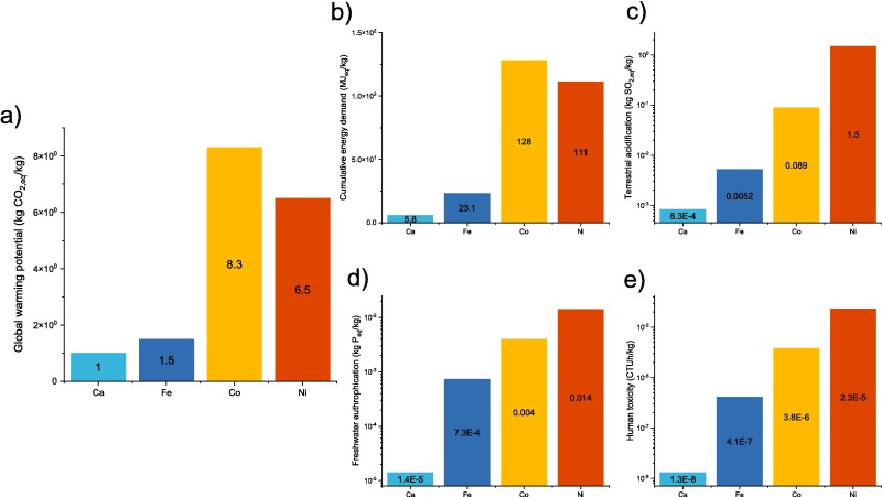 Nickel and cobalt [13], [14], [15], [48] are mostly used as nitrate form for biomass wet impregnation which are harmful and nature polluting. Iron is less toxic, available and has a similar, if not better, catalytic effect. An acid leaching step is usually done after graphenization with transition metal catalysts. Calcium catalyst is nontoxic, and has lower environmental impact than transition metals [51]. During graphenization, calcium particles volatilize above 1400 °C [51]. Calcium is selected as graphenization catalyst in scenario S2 to avoid leaching step and impacts associated with extraction, toxicity and emissions. Based on the catalyst to biomass ratio of Béguerie et al [51], catalyst represent 3.02 kg input with 6.7 kg of biomass. The impregnation process with inputs and outputs of water as well as the gas emission of catalytic pyrolysis should be investigated. Another difference between S1 and S2 is the pyrolysis temperature. Biocarbon produced at 1400 °C with calcium catalyst presented highly crystalline graphenic structures. At 1600 °C, no calcium species were detected [51]. When working in a similar furnace than in S1 at 1600 °C instead of 2000 °C, the save in energy consumption will positively impact the overall system. A first approximation of energy saving is achieved using the enthalpy balance [126], as defined in Equation (3) where